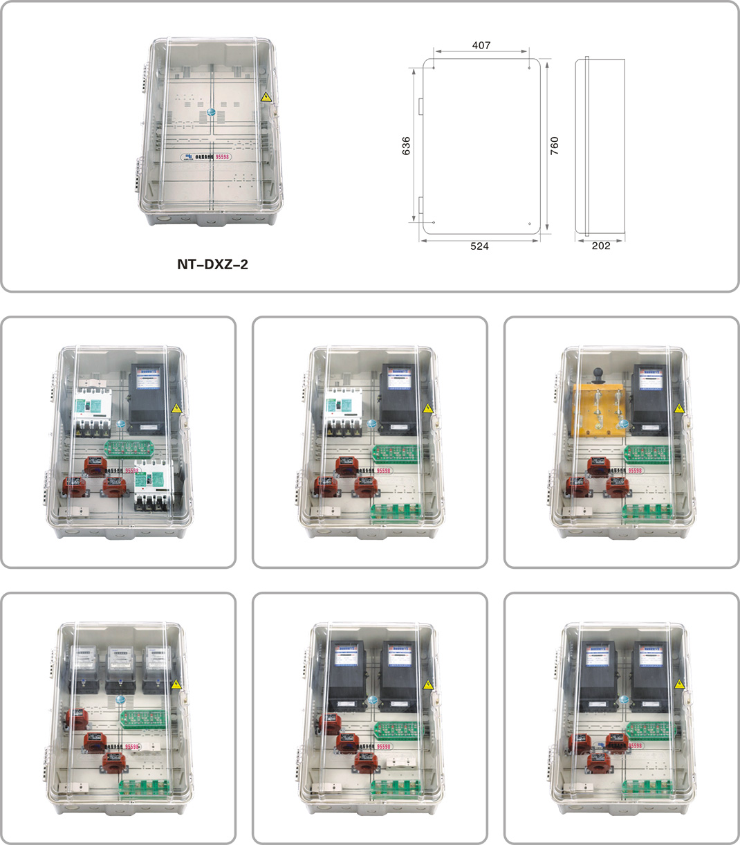 NT-DXZ系列三相多功能动力计量箱是一种功能多样化、防窃电透明化的新一代计量配电箱,可满足不同用户的多种需求。具有体积小、功能多变、组合方便等特点,箱内空间可依据客户需求设置各类电表、电流互感器、低压熔断器、低压断路器、进出线端子、联合接线盒的安装位。底座上设有各类安装槽,方便安装各类原件,并可以在预付费电表、开关相应的位置设置IC卡窗口和开关窗口。